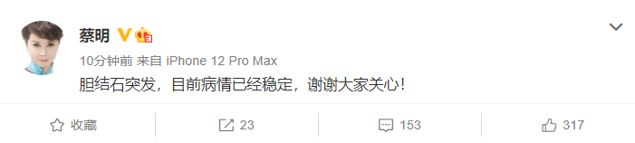 3月19日,蔡明在个人微博发文报平安,称自己胆结石突发,目前病情已经稳定,谢谢大家关心! 此前,有媒体拍到蔡明录节目突发不适被送医的照片。