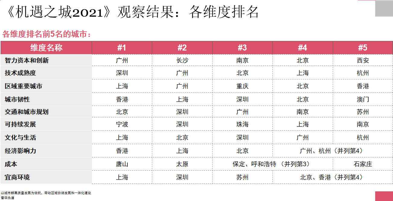 《机遇之城2021》的10个维度排名前五名的城市以及完整综合排名