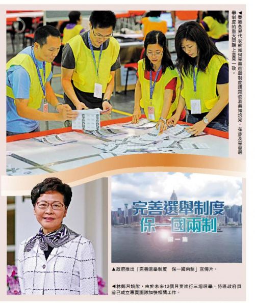 行政长官林郑月娥说,由于未来12个月要进行三场选举,特区政府已成立专责团队加快相关工作,并建议立法会先成立小组委员会讨论相关内容。由特区政府制作的《完善选举制度 保一国两制》系列宣传片昨日亦推出第一集。各界期望政府未来继续快马加鞭,尽快全面落实"爱国者治港"原则。