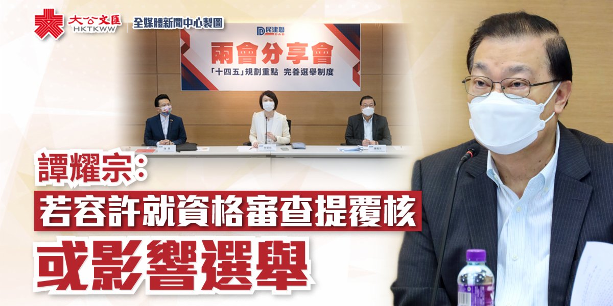 大公文汇全媒体报道:民建联今日(19日)举办分享会,介绍「十四五」规划纲要重点内容及全国人大完善香港选举制度的决定。全国人大常委会委员谭耀宗在会上表示,当候选人资格审查委员会作出某人是否符合参选资格的决定后,如果法庭容许当事人提出司法覆核,对选举可能带来影响。