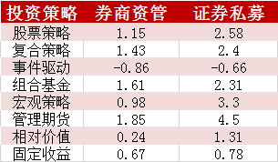 分策略来看,除事件驱动策略外,券商资管其余七大策略平均收益全部为正,管理期货策略平均收益1.85%坐稳冠军席位,组合基金策略上涨1.61%次之,复合策略与股票策略今年以来平均收益分别为1.43%、1.15%。与证券私募的成绩相比,券商资管八大策略的平均收益全部跑输。