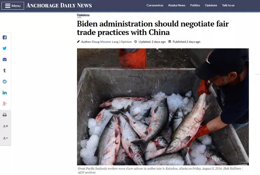 文章的作者是安克雷奇所在州阿拉斯加本地官员,阿拉斯加渔猎部部长。文章呼吁,美国政府应该与中国商讨海产品与木材贸易问题。