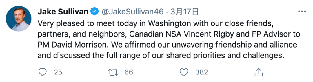 对话前一天,沙利文特意发了一条在华盛顿与加拿大高层会面的推文,还特意提到了“坚定不移的友谊和联盟”。