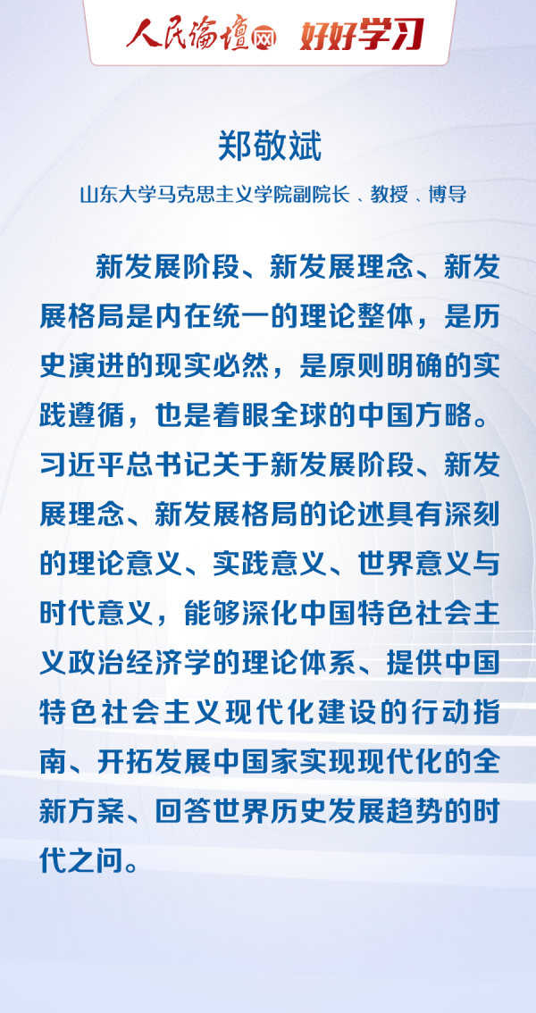 习近平总书记指出,“进入新发展阶段、贯彻新发展理念、构建新发展格局,是由我国经济社会发展的理论逻辑、历史逻辑、现实逻辑决定的。进入新发展阶段明确了我国发展的历史方位,贯彻新发展理念明确了我国现代化建设的指导原则,构建新发展格局明确了我国经济现代化的路径选择。”为深入学习贯彻党的十九届五中全会精神,推动“十四五”时期高质量发展,确保全面建设社会主义现代化国家开好局、起好步,人民论坛特邀权威专家围绕新发展阶段、新发展理念、新发展格局及其相互关系进行了系统深入解读,今天,我们为您整理精华观点,一起学习。