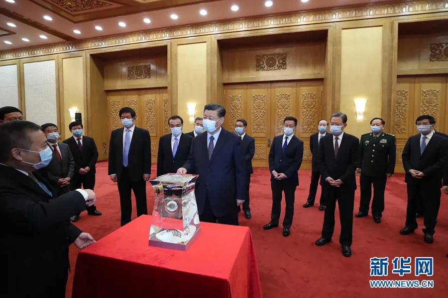 2021年2月22日,北京人民大会堂,习近平总书记亲切会见探月工程嫦娥五号任务参研参试人员代表并参观月球样品和探月工程成果展览。总书记深情寄语航天科技工作者:继续发挥新型举国体制优势,加大自主创新工作力度,为增进人类福祉作出新的更大贡献。作为我国复杂度最高、技术跨度最大的航天系统工程,嫦娥五号任务突出彰显了中国自主创新实力,是中国科技自立自强的典范。