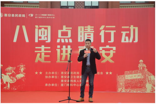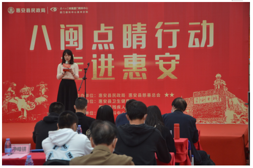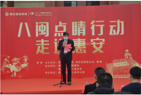 当天,惠安县民政局钱晓明副局长、惠安县卫生健康局蔡惠坤副局长、惠安县慈善总会杜邵玉秘书长,惠安县残疾人联合理事会陈隐静主任,厦门大学附属厦门眼科中心侯家敏院长上台,正式启动“八闽点睛行动走进惠安”。