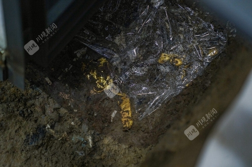 发掘深度到50厘米左右时,文物开始逐渐展露。李玉牛告诉川观新闻记者,最开始出现的是一些小的穿孔金圆片,然后发现了大量白色和灰黑色的碎片,通过成分分析等检测方法鉴定为象牙,然后在5号坑中间偏西南位置,一块比较大的金箔开始出现。