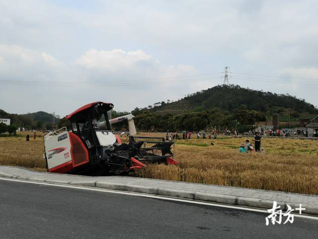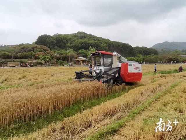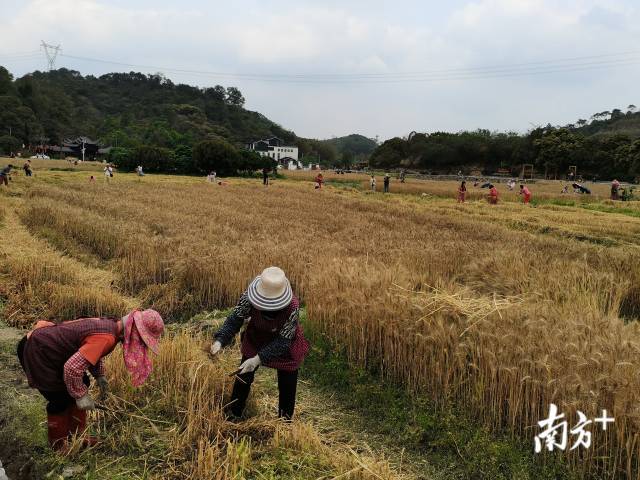 3月20日,在广州从化的罗洞工匠小镇,50亩金灿灿的麦田迎来了成熟收割期,农民收割忙个不停。