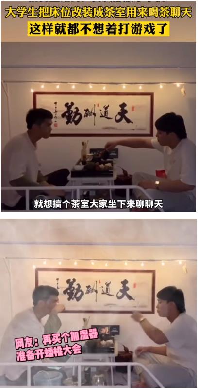 近日,广西南宁一名大学生把宿舍改装成茶室的视频引发关注。据王同学介绍,舍友们课余时间回到宿舍,总喜欢打游戏、玩手机。他就想到在宿舍里弄一个茶室,大家可以一起喝喝茶,聊聊天,就不想着打游戏了。