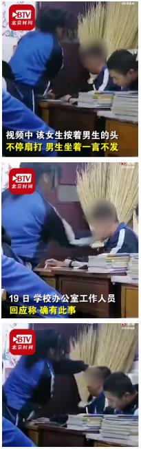 针对网传的“灵台县职业中专女生按着男同学头狂扇耳光”视频,3月20日凌晨,甘肃省灵台县教育局通报调查情况称,此事系双方产生矛盾引发。灵台县教育局称,经调查,被打男学生与打人女学生系灵台县职业中专同班学生,18日中午男生进教室时用脚踢开教室门,女生责问时双方发生口角并产生肢体冲突;晚上女生因对白天男生辱骂其父母仍很愤慨,在教室内朝男生脸上扇了多个巴掌,被同学拍摄视频上传至网络。