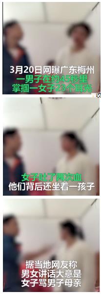 3月20日,网曝广东梅州一男子在约45秒时间里,掌掴一女子23个耳光,女子吐了两次血,而他们背后还坐着一孩子。据当地网友称,男女讲话大意是女子骂男子母亲,并说“你越打我越骂”,最后男子质问“有你这样做女人的嘛”。