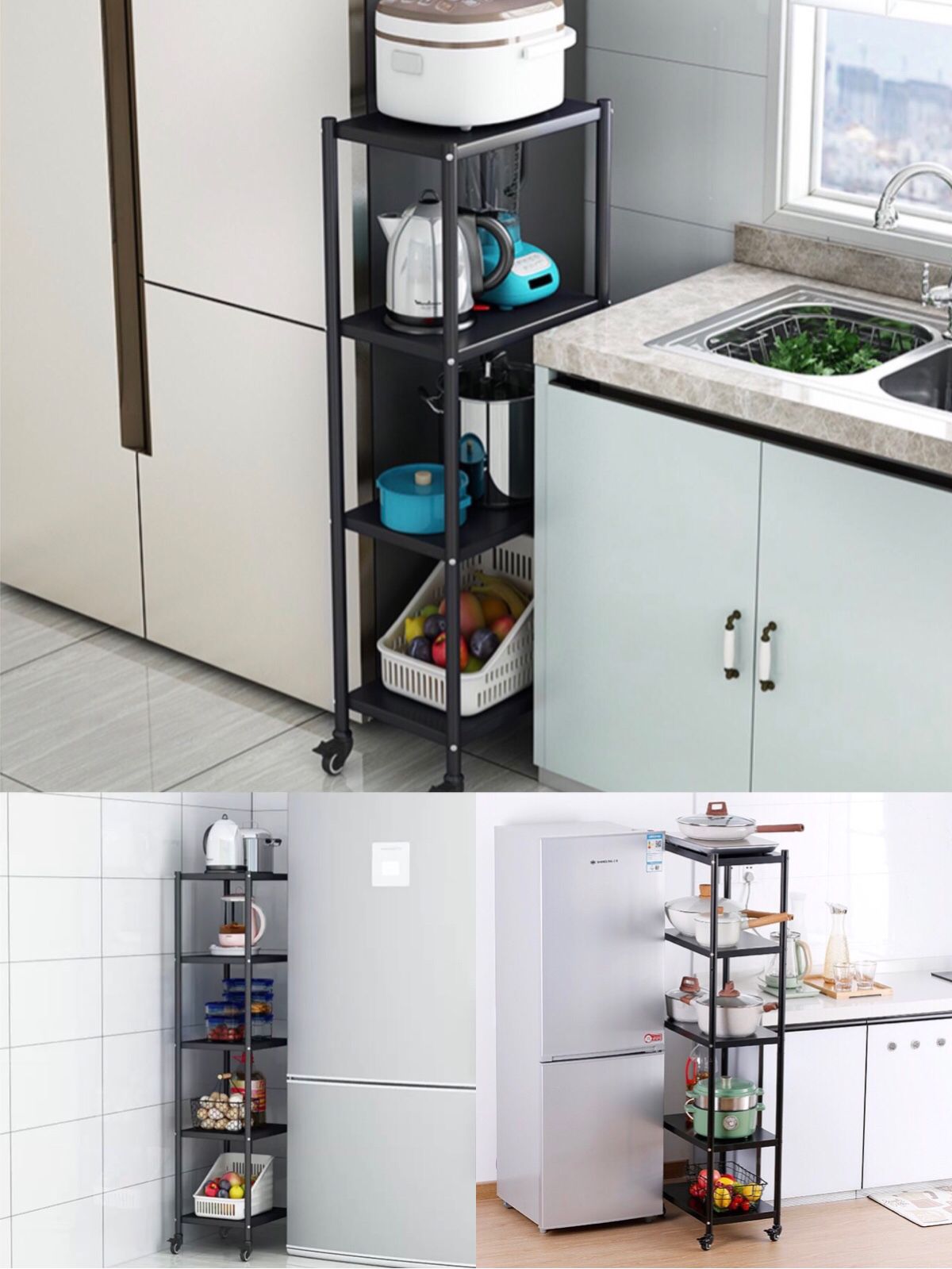 房间中或多或少会有狭窄的缝隙空间,对于小户型而言不得不“见缝”就填。置物架顺应这样的需求,带来各种类型和尺寸的产品。如在冰箱和案桌之间放入合适的置物架,收纳各种瓶瓶罐罐的食材辅料等小物,有效利用空间又能让空间变整洁。
