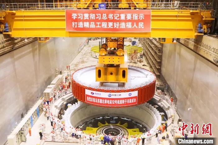 近期,由水电八局负责安装的乌东德右岸电站最后一台85万千瓦水轮发电机组(12号)转子精准落入机坑。12号机组转子由中心体、扇形体支架、大立筋、磁轭及磁极组成,重达1882吨,最大直径17.76米,高度3.6米。