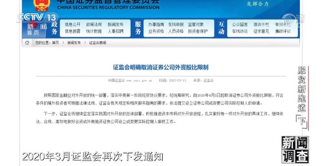 2018年,中国人民银行行长易纲在博鳌亚洲论坛宣布进一步扩大金融业对外开放的具体措施和时间表,其中包括将证券公司、基金管理公司、期货公司、人身险公司的外资持股比例上限放宽至51%,三年后不再设限;2020年3月证监会再次下发通知,证券公司、基金管理公司外资持股比例限制正式取消。