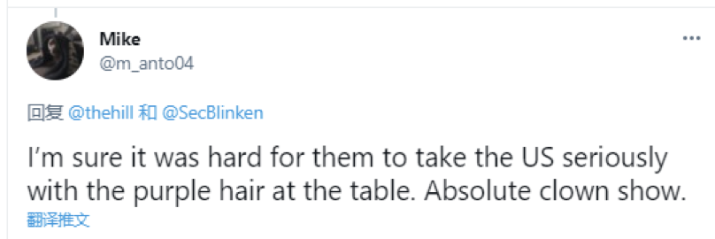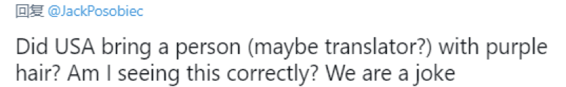 还有网友表示:“这是一场敏感和重要的会议,美国带一位紫色头发的翻译来,显得不明白场合的重要性。”