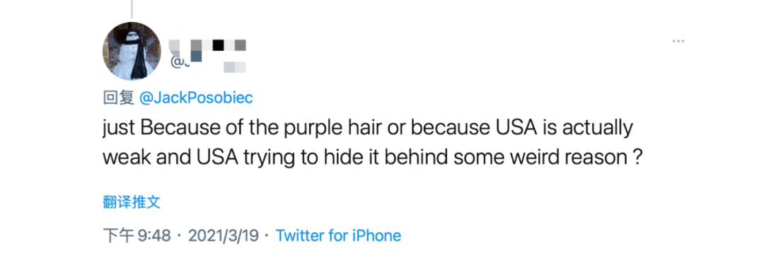 还有网友更深一层反思,“仅仅是因为紫色的头发,还是因为美国实际上很虚弱,而美国却试图将其隐藏在某些奇怪的原因背后?“