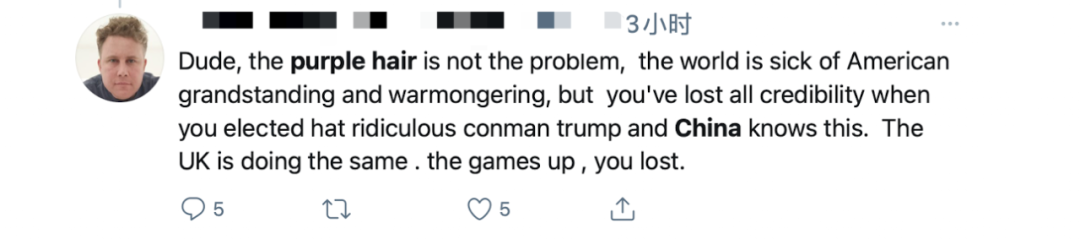 还有网友表示,“紫色头发本身不是错,而是全世界都已经厌倦了美国的哗众取宠和‘战争贩子’的形象。美国已经失去了所有的信誉。比赛结束了,你输了。”