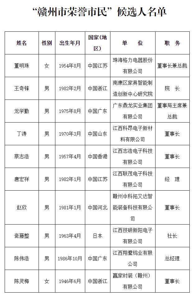 赣州市人民政府官网3月19日发布的“赣州市荣誉市民”候选人公示显示:根据《赣州市授予荣誉市民称号规定》,经各地、各单位推荐和资格审核,同意推荐董明珠、王奇锋、龙学勤、丁涛、蔡志浩、唐宏祥、赵欣、斋藤整、陈伟浩、陈灵梅10人为“赣州市荣誉市民”人选,现予以公示。为进一步听取群众意见,现通过赣州市人民政府门户网站向社会公示。