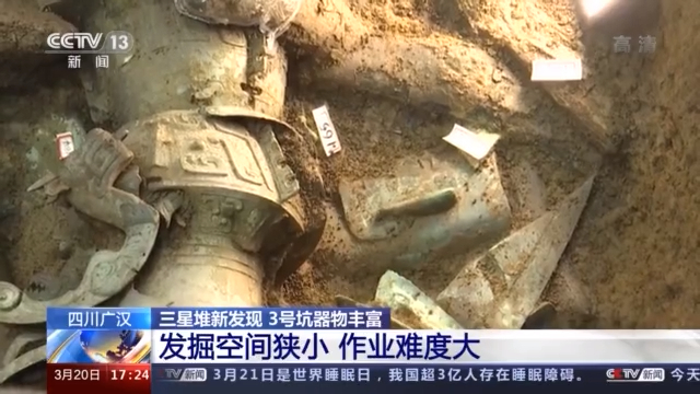 据央视新闻消息,3号坑仅器物层表面已探明的文物就已达百余件。3号坑发掘面积仅有十几平方米,随着文物不断露出,留给考古队员的工作空间越来越少。