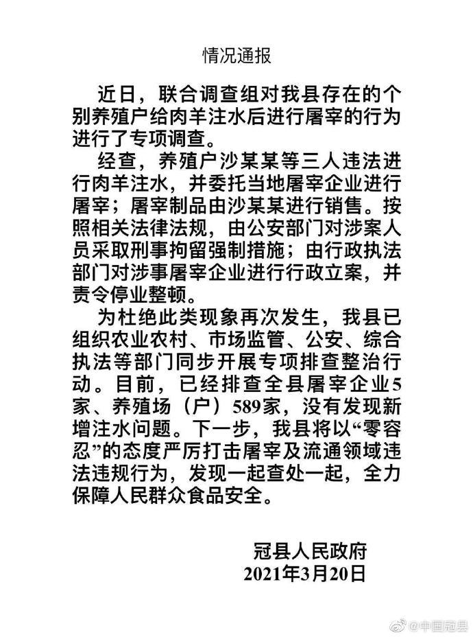 3月20日,山东省冠县通报“活羊注水”事件调查处理情况。