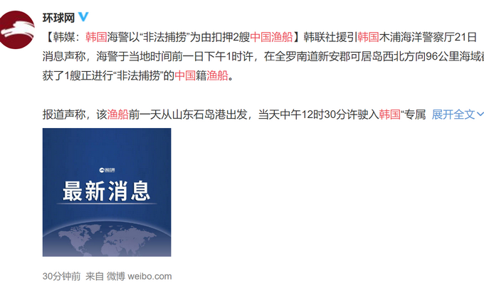 报道声称,该渔船前一天从山东石岛港出发,当天中午12时30分许驶入韩国“专属经济海域”(EEZ)“非法捕捞”。