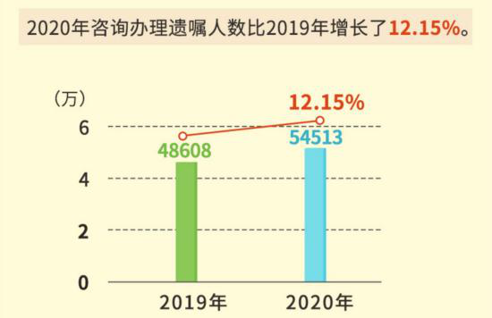 中华遗嘱库3月19日正式向社会发布了《2020中华遗嘱库白皮书》,截至2020年底,中华遗嘱库已向社会提供遗嘱咨询25.6万人次,登记保管了19万份遗嘱,目前已生效遗嘱共计954份。2020年受疫情影响,中华遗嘱库暂停线下服务两个月,但全年遗嘱咨询办理的数量不但未受到负面影响,反而出现了一定比例的增长。从数据上看,2020年咨询办理遗嘱人数比2019年增长了12.15%。