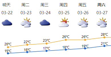 预计3月21日夜间至22日上午,我市阴天间多云,有零星小雨,22日早晨最低气温降至14-15℃,沿海、高地和海区最大阵风7-8级,体感较凉,22日午后转多云,风力减弱。23-28日多云间晴天,气温逐日回升,天气再趋温暖湿润。