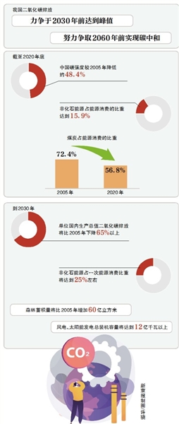 2020年9月22日,习近平主席在第75届联大一般性辩论上宣布,中国将提高国家自主贡献力度,采取更加有力的政策和措施,二氧化碳排放力争于2030年前达到峰值,努力争取2060年前实现碳中和。2020年12月12日,习近平主席在气候雄心峰会上进一步宣布:到2030年,中国单位国内生产总值二氧化碳排放将比2005年下降65%以上,非化石能源占一次能源消费比重将达到25%左右,森林蓄积量将比2005年增加60亿立方米,风电、太阳能发电总装机容量将达到12亿千瓦以上。
