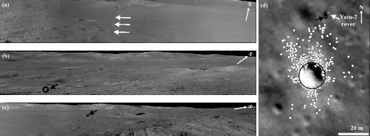 ——已有研究结果显示,位于着陆区西北方向的织女撞击坑的一条溅射纹恰好穿过了着陆点附近区域,而溅射纹内常常可见由溅射物形成的二次撞击坑。“玉兔二号”巡视区确实还能观察到若干个内部和周边均存在碎块状物质的米级和亚米级的新鲜撞击坑(图 5)。结合椭圆撞击坑的长轴方向推断,这些新鲜撞击坑应当为织女撞击坑溅射物形成的二次撞击坑。