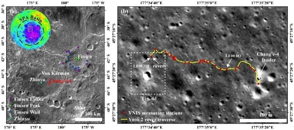 图 1.(a)“ 嫦娥四号”着陆区地质背景图;(b)“ 玉兔二号”前13月昼巡视路线图