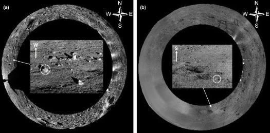 多项研究揭示,嫦娥四号着陆区被35亿年前形成的芬森撞击坑的溅射物覆盖。这些溅射物经历长时间的演化后,形成了一层大约12米厚的细粒月球土壤。而在第3和13月昼期间,“玉兔二号”月球车发现巡视区存在较多的石块(图2)。“玉兔二号”月球车通过详细的就位探测,获得了两块代表性石块的光谱和周围地貌的全景影像图。