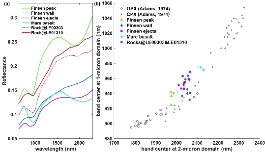 光谱对比结果显示(图 3),石块的光谱吸收特征与芬森撞击坑物质的光谱吸收特征较为接近,而与冯·卡门撞击坑内部玄武岩的光谱吸收特征差异较大。这说明了这些石块并非是本地玄武岩,而它们极有可能源自芬森撞击坑溅射物。