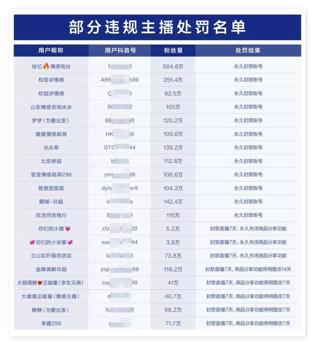 近30天内,平台共处理相关违规直播间446个,封禁违规账号33个,包含“徐忆??情感电台”“权哥讲情感”“光头哥”等10个粉丝超百万主播。