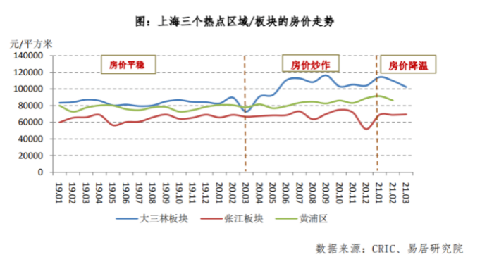 易居研究院对上海浦东大三林板块、张江板块和黄浦区三个学区相对热的区域/板块进行分析发现,这三个区域/板块的价格在2019年较为稳定,而到了2020年尤其是二季度开始,浦东三林板块、张江板块开始出现价格明显上涨,同时市场开始出现一房难求、哄抬房价、预期不稳等乱象。