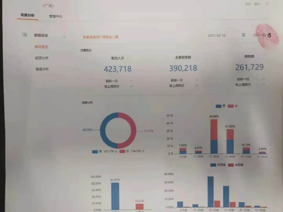 通过查看吾悦广场汇客云系统,发现该公司所运行的汇客云系统中有大量客流量分析数据,该系统通过人脸识别可以分析当日及最近一个月的客流人数、去重顾客数、男女比例、新老顾客数、年龄分布、返店顾客性别年龄占比、到访次数男女占比等数据。