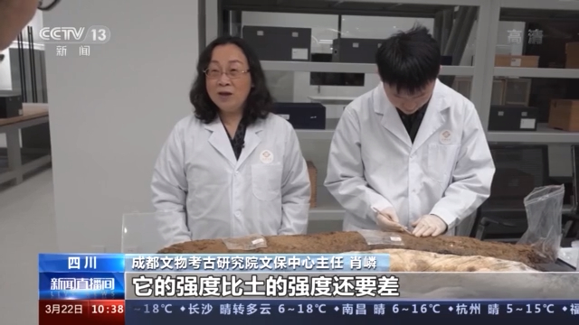 成都文物考古研究院文保中心主任 肖嶙: 糟朽的象牙的话,它的强度比土的强度还要差。稍稍一用劲儿,就会垮掉,所以清理工作这个都是要凭他们的手感,用这种小小的竹签,一点一点的把土清理出来。