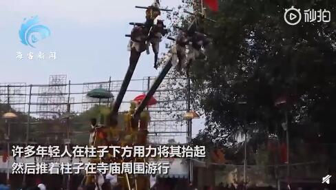 【印度民众将上千名新生儿绑柱子上抬到高空游街示众 惨叫连绵不断】据RT新闻3月21日报道,印度南部的一座寺庙举行了一个戏剧性的仪式,人们将1000多名新生婴儿和成人一起绑在柱子上,用临时的起重机抬起地面,然后推着柱子在寺庙游行示众。