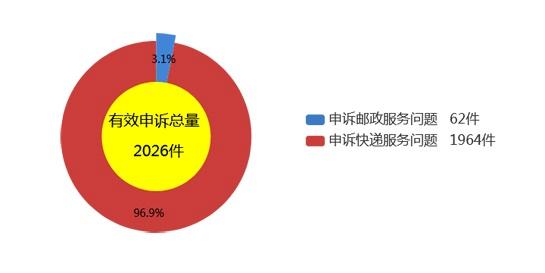 受理的申诉中有效申诉(确定企业责任的)为2026件,环比增长11%,同比增长3.7%。有效申诉中涉及邮政服务问题的62件,占有效申诉量的3.1%,环比增长37.8%,同比增长8.8%;涉及快递服务问题的1964件,占有效申诉量的96.9%,环比增长10.3%,同比增长3.5%。