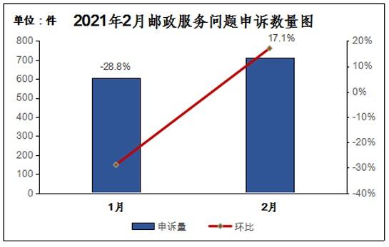 用户对邮政服务问题申诉711件,环比增长17.1%,同比增长5.5%。