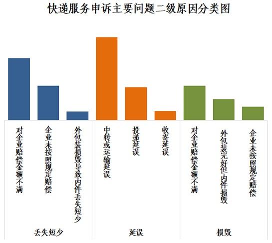 邮件延误申诉中主要占比是中转或运输延误,投递服务申诉中主要占比是虚假签收,邮件丢失短少申诉中主要占比是企业未按照规定赔偿。