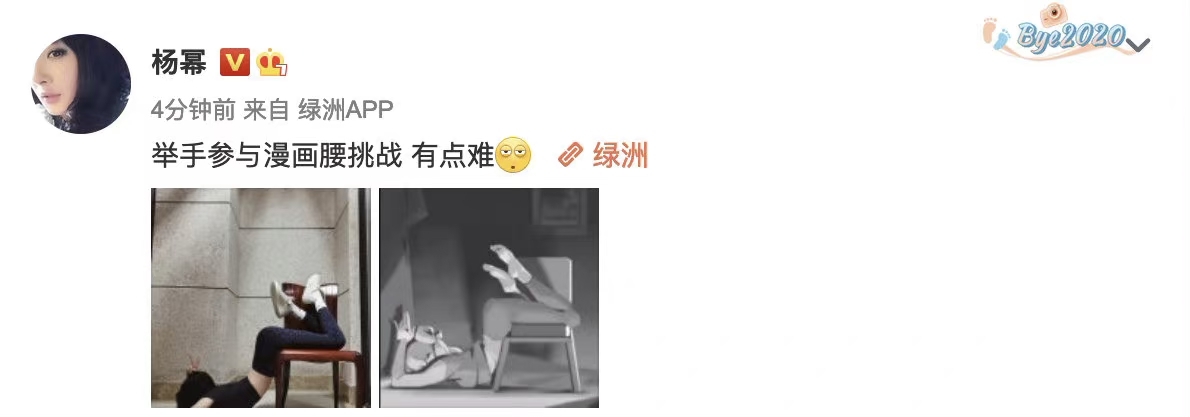 刚刚,杨幂发文为挑战漫画腰道歉,她表示,因为一时好奇所以挑战了这个高难度的拉伸动作并发布了照片,没有想到这个动作可能会对身体有害,对此她深表歉意,并告诫大家要在安全范围内尝试健康的拉伸动作。