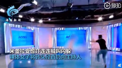 【罗马尼亚电视节目直播突遇意外:裸女持砖头大闹演播室,女主播惊叫逃窜】当地时间19日,罗马尼亚电视节目女主持人米蕾拉·维达在录制节目时突遭意外。画面中,米蕾拉正在演播室播报,突然一名裸体女子手持砖头闯进演播室直冲主持人。米蕾拉受惊吓连连喊叫闪躲,裸体女子将砖头径直扔向主持人。随后两名工作人员上前制服了女子,而节目一度中断,现场画面也被切走。