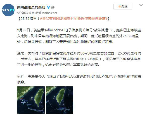 另外,美海军今天也派出了1架P-8A反潜巡逻机和1架EP-3E电子侦察机前往南海侦察。