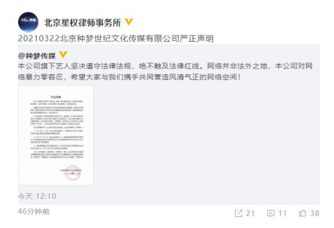 声明中还提到经纪公司向发布有关内容的网络营销公司发出撤稿通知时,对方提出“付费删帖”的违法诉求,同时还要求缴纳“保护费”。在警方传讯下,该公司承认其以诽谤形式侵犯周延的名誉权,已公开道歉。