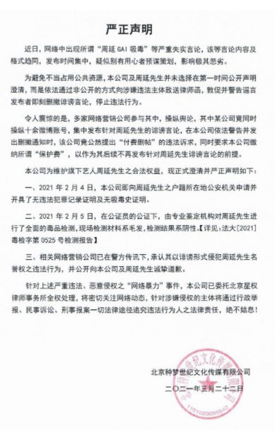 声明称GAI选择了做毒品检测自证清白,2021年2月4日,GAI向户籍所在地派出所开具了无违法记录证明和无吸毒史证明。2月5日,有专业的鉴定机构对GAI做了全面的毒品检测,结果均呈阴性。