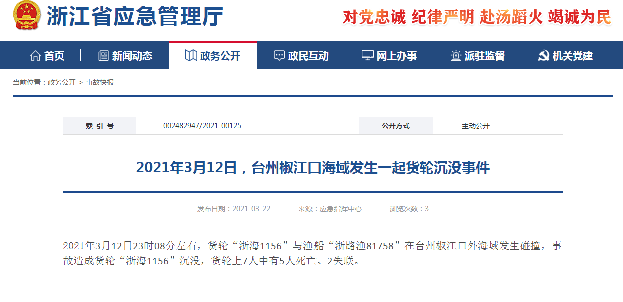 2021年3月12日23时08分左右,货轮“浙海1156”与渔船“浙路渔81758”在台州椒江口外海域发生碰撞,事故造成货轮“浙海1156”沉没,货轮上7人中有5人死亡、2失联。