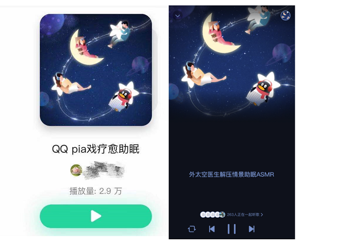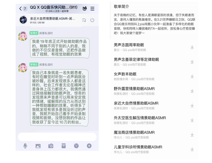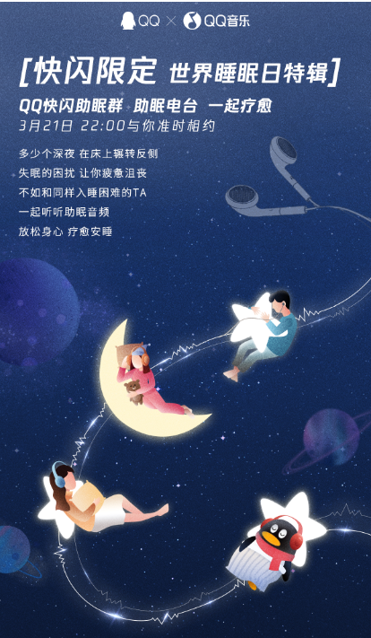作为一个年轻人的社交平台,QQ一直都是年轻亚文化的孕育之地,亦早已关注到pia戏圈里用人声助眠的这个亚文化。为了帮助广大Q友们提高睡眠质量、缓解睡眠障碍所带来的不适,QQ邀请了pia戏爱好者们精心制作了一系列pia戏疗愈助眠音频专辑,并在3月21日世界睡眠日这一天,联合QQ音乐发起了“快闪助眠群”活动,邀请网友进群使用「一起听歌」共同聆听,放松身心。
