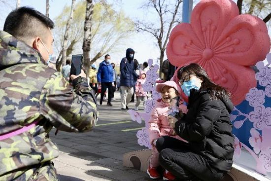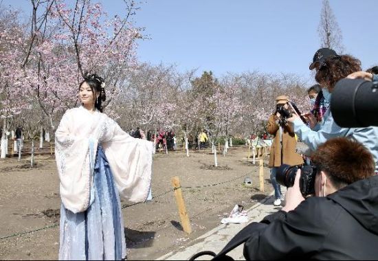 3月20日,2021年北京玉渊潭公园春季赏花文化活动暨樱花鲁冰花花卉联展开幕。当日适逢春分节气,公园内游人如织,民众赏花游玩。图为一名穿汉服的游客在樱花树前拍照。(来源:中新社 摄影:易海菲)