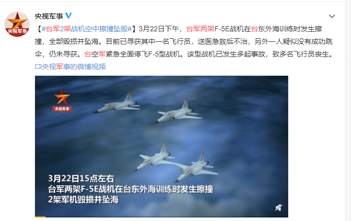 3月22日下午,台军两架F-5E战机在台东外海训练时发生擦撞,全部毁损并坠海。目前已寻获其中一名飞行员,送医急救后不治,另外一人疑似没有成功跳伞,仍未寻获。台空军紧急全面停飞F-5型战机。该型战机已发生多起事故,致多名飞行员丧生。