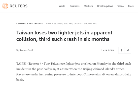 22日,台军2架战机在训练中碰撞导致坠海,目前已有一名飞行员确认死亡。不过,路透社在报道此事时,却把台军这次训练事故怪到了大陆头上。